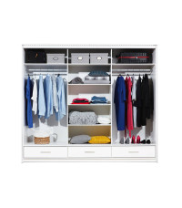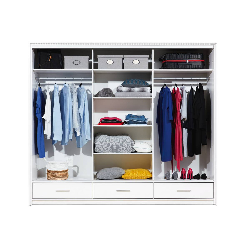 Szafa w kolorze białym z kolekcji Marsylia to doskonała propozycja do pokoju dziennego, ale znajdzie swoje miejsce również w innym pomieszczeniu, jak na przykład - przedpokój czy garderobie, sypialni. Materiał wykonania to płyta laminowana. Szafa posiada półki, drążek na ubrania oraz szuflady. Dodatkowym atutem jest oświetlenie w zestawie. Duża szafa posiada również lustro, które sprawi, że pomieszczenie stanie się optycznie większe. Szafa będzie świetnym miejscem do wieszania ubrań, na buty lub inne domowe tekstylia. Nowoczesny styl mebli wpadnie do gustu każdemu, kto poszukuje eleganckiego, klasycznego, a zarazem nowoczesnego umeblowania. Idealnie wpasuje się w większość aranżacji. Szafa przeznaczona do samodzielnego montażu.