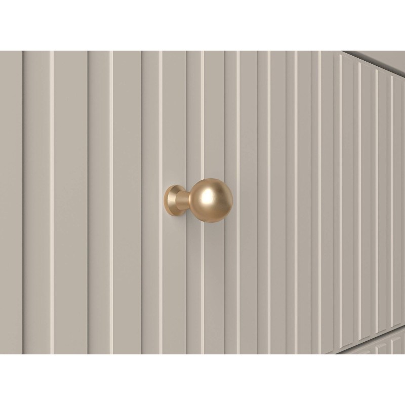 Meble z kolekcji Sophie to idealny wybór do współczesnego salonu, sypialni czy przedpokoju. Dzięki systemowi złożonemu z wielu brył urządzisz swoje wymarzone wnętrze. Kaszmirowy dekor to niebanalny i ponadczasowy kolor, nazywany nowym białym. Frezowane fronty MDF podkreślają wyrafinowanie i elegancję całej kolekcji. Dyskretne czarne nóżki dodają bryłom efektownej lekkości. Kropką nad i, dodatkowo budującą estetykę wszystkich mebli Sophie są uchwyty ze szczotkowanego metalu, w złotym wybarwieniu.