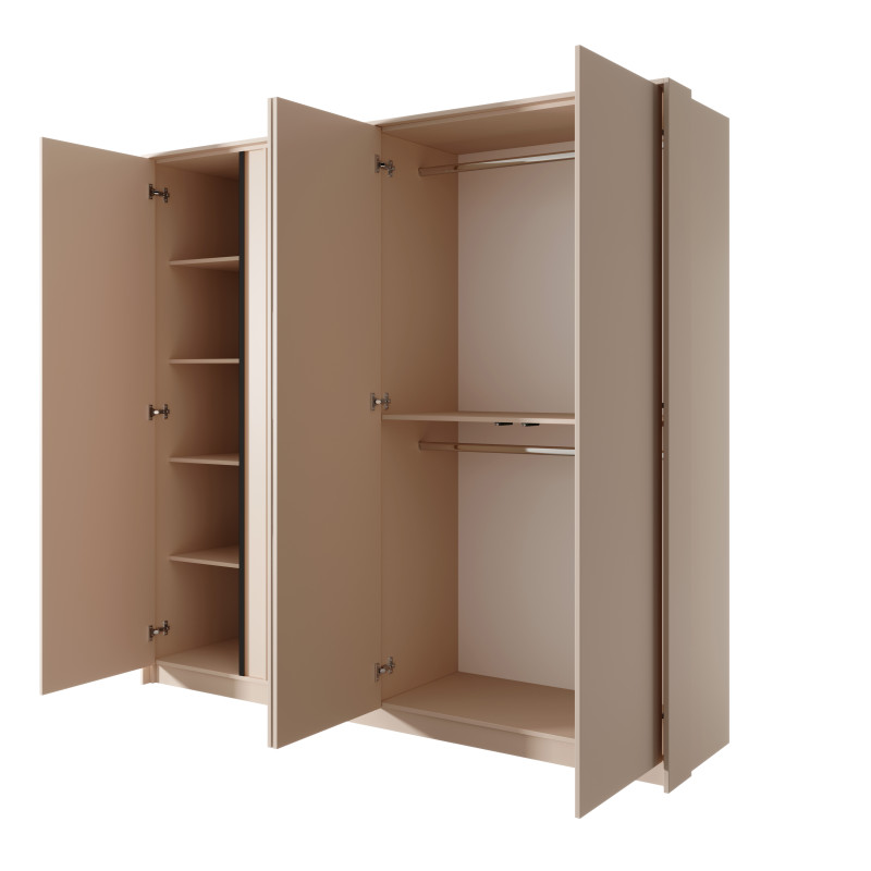 Szafa DAST I 220 to połączenie minimalistycznego designu z dużą pojemnością. Dzięki szerokości ponad 220 cm z łatwością przechowasz odzież, dodatki i inne przedmioty. Beżowe wykończenie i geometryczna forma świetnie wpisują się w nowoczesne wnętrza. Mebel został wykonany z płyty laminowanej o grubości 16 mm, wykończonej trwałym obrzeżem ABS. Czarne, metalowe nóżki dodają stabilności i elegancji. Wymiary: 223,2 × 55,4 × 210 cm (dł. × gł. × wys.)