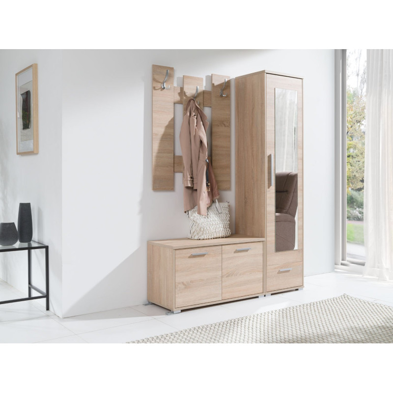Szafa wysoka HIT H01 to idealne rozwiązanie dla Twojego przedpokoju, oferujące praktyczne funkcje i elegancki design. Wyposażona w jedne drzwi z funkcjonalnym lustrem, jest doskonałym wyborem dla tych, którzy cenią sobie praktyczne rozwiązania w swoim domu. Jej wnętrze zostało starannie zaprojektowane, aby pomieścić wszystkie niezbędne rzeczy. Na górze znajduje się przestronna półka, idealna do przechowywania rzeczy, na których zależy Ci, aby były zawsze pod ręką. Pod półką umieszczony jest wytrzymały drążek na płaszcze i kurtki, zapewniając porządek w Twoim przedpokoju. Dodatkowo, na dole szafy znajduje się praktyczna szuflada, doskonała do przechowywania drobnych przedmiotów, takich jak rękawiczki, chusty czy inne akcesoria, które chcesz trzymać w zasięgu ręki. Ta uniwersalna szafa może być z łatwością dostosowana do Twoich potrzeb, ponieważ montaż frontu jest możliwy zarówno z prawej, jak i lewej strony, pozwalając Ci zoptymalizować układ mebli w Twoim przedpokoju. Wykonana z wysokiej jakości płyty meblowej laminowanej o grubości 16 mm, szafa dostępna jest w dwóch eleganckich kolorach: białym oraz dąb sonoma, zapewnia funkcjonalność oraz dodaje stylu i klasy do Twojej przestrzeni. Jej solidna konstrukcja zapewnia trwałość przez wiele lat użytkowania, a minimalistyczny design sprawia, że będzie pasować do różnych aranżacji wnętrz, niezależnie od ich stylu.