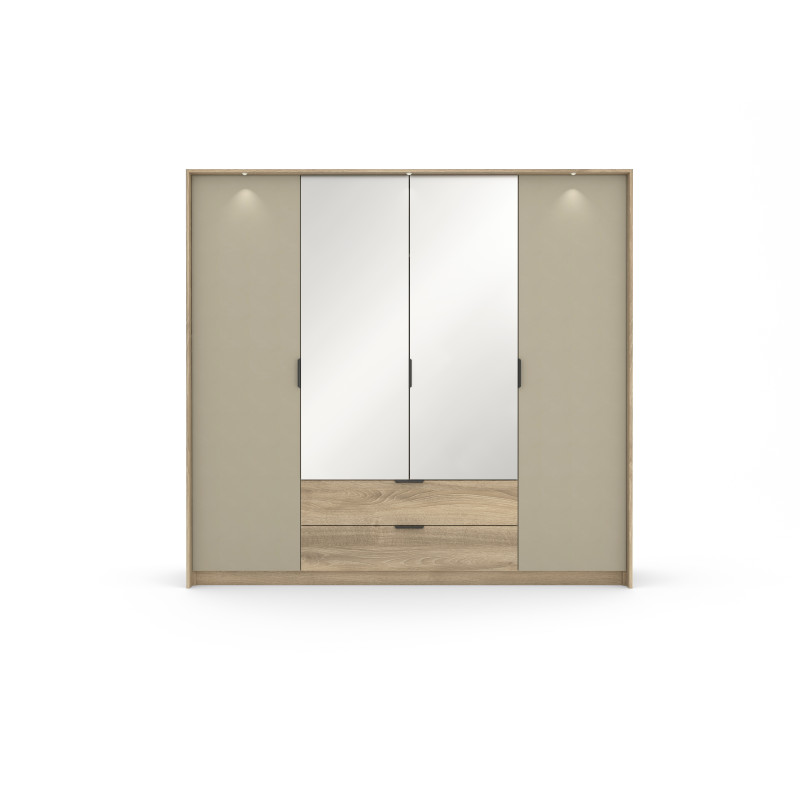 Szafa Letto 4d2s to pojemny i solidny mebel o wymiarach 223,2 × 210 × 59 cm, idealny do przestronnej sypialni. Korpus i front wykonano z laminowanej płyty wiórowej E05 w dwóch kontrastujących kolorach: szarym kamiennym i dębie terra ciemnym. Dzięki aż czterem drzwiom oraz dwóm praktycznym szufladom, szafa oferuje mnóstwo miejsca na ubrania, akcesoria i inne rzeczy codziennego użytku. Całość dopełniają czarne metalowe uchwyty, które nadają jej nowoczesny charakter. Prowadnice kulkowe z pełnym wysuwem i domykiem oraz bliźniacze zawiasy zapewniają komfort użytkowania na co dzień. Szafa doskonale wkomponuje się w nowoczesne wnętrza utrzymane w neutralnych, ciepłych tonacjach. To świetny wybór do strefy prywatnej, gdzie liczy się zarówno wygląd, jak i funkcjonalność.