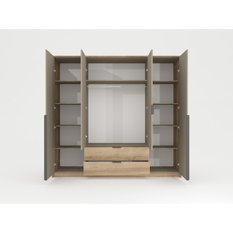 Szafa Letto 4d2s to praktyczne i stylowe rozwiązanie do sypialni lub garderoby. Połączenie dębu terra ciemnego i szarego kamiennego frontu tworzy elegancką, nowoczesną całość. Funkcjonalność i estetyka w jednym meblu – warto ją mieć u siebie!