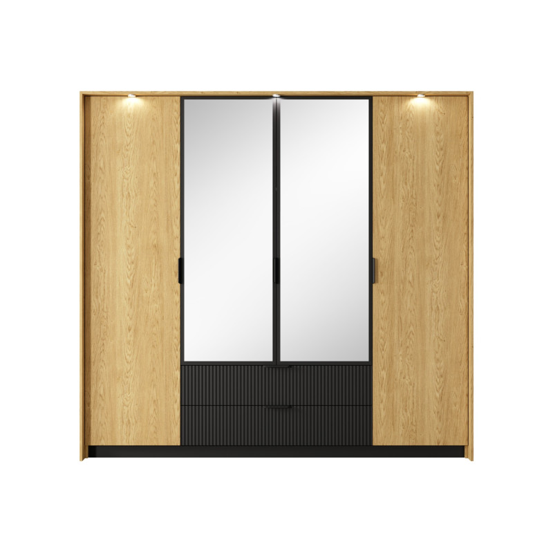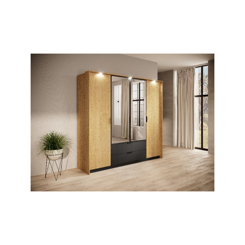 Szafa Baltic to mebel, który z powodzeniem wzbogaci każdą sypialnię, łącząc estetykę z funkcjonalnością. Jej szerokość 223,2 cm, wysokość 210 cm i głębokość 59 cm zapewniają przestronność, dzięki której z łatwością pomieścisz wszystkie niezbędne ubrania i akcesoria. Fronty w kolorze dąb baltic oraz subtelne akcenty czerni metalowych uchwytów i nóg nadają jej nowoczesnego charakteru, który idealnie komponuje się z różnorodnymi stylami wnętrz. W szafie zastosowano zaawansowane rozwiązania, takie jak kulkowe prowadnice szuflad z pełnym wysuwem i zawiasy z domykiem, co zapewnia wygodę i ciszę przy codziennym użytkowaniu. Opcjonalne oświetlenie LED w szafie dodaje jej wyjątkowego uroku, tworząc przyjemną atmosferę w sypialni. Dzięki wysokiej jakości materiałom, jak płyta wiórowa laminowana i metalowe detale, mebel cechuje się dużą trwałością i odpornością na uszkodzenia. Szafa Baltic to połączenie nowoczesnego designu z funkcjonalnością, idealna do każdego wnętrza, które potrzebuje zarówno stylu, jak i praktycznego rozwiązania do przechowywania.