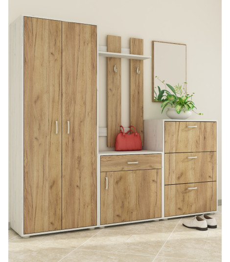 Przedpokój 3 Craft Biały / Craft Złoty o wymiarach: szerokość 204 cm, głębokość 41 cm i wysokość 180 cm to rozbudowany zestaw do przechowywania, który spełni oczekiwania nawet bardziej wymagających użytkowników. Wykonany z matowej płyty meblowej, zestaw obejmuje szafę ubraniową z drążkiem na wieszaki, praktyczną szafkę na buty z miejscem na około 8 par, jedną szufladę, wieszak z czterema białymi haczykami oraz duże, prostokątne lustro w ramie. Fronty otwierane są klasycznie, za pomocą uchwytów z tworzywa sztucznego, a zastosowanie prowadnic rolkowych gwarantuje płynne działanie szuflady. Połączenie bieli z naturalnym odcieniem drewna sprawia, że całość wygląda nowocześnie i lekko, jednocześnie zachowując ciepły, domowy klimat. Idealny do większych przedpokojów, które wymagają nie tylko stylu, ale i funkcjonalnego rozplanowania przestrzeni.