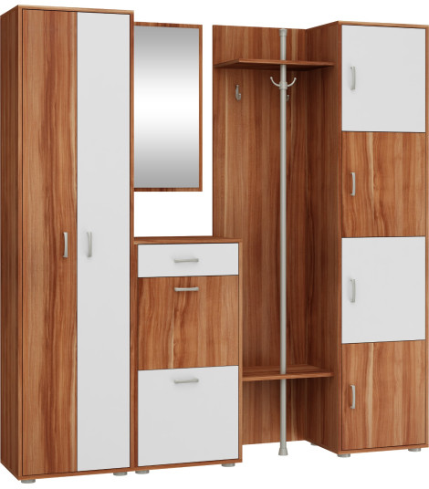 Przedpokój 5 Śliwa Wallis / Biały to zestaw, który łączy naturalny urok drewna z nowoczesną funkcjonalnością. Idealny do uporządkowania przestrzeni i nadania przedpokojowi ciepłego, przytulnego charakteru.