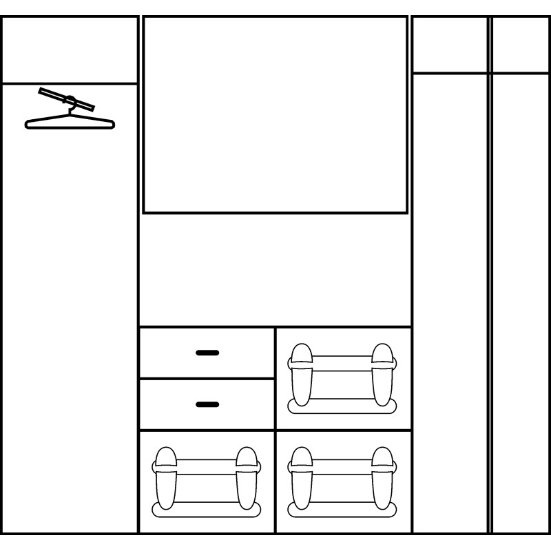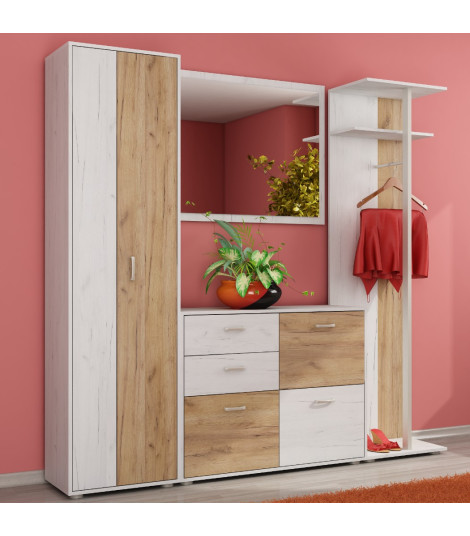 Zestaw Przedpokój 7 Craft biały/Craft złoty ma wymiary 211 cm szerokości, 198 cm wysokości oraz 37 cm głębokości, oferując dużo miejsca na przechowywanie i organizację przestrzeni. Korpus oraz fronty wykonane są z wysokiej jakości płyty laminowanej, łącząc trwałość z estetyką. Mebel wyposażony jest w praktyczne wieszaki, jedną szafę oraz trzydrzwiową szafkę z klapami i dwiema szufladami, co zapewnia dużą funkcjonalność. Lustro o prostokątnym kształcie optycznie powiększa przestrzeń i dodaje jej lekkości. Uchwyty z tworzywa sztucznego w kolorze satyny gwarantują wygodę użytkowania. Przedpokój 7 Craft biały/Craft złoty to elegancki i praktyczny zestaw, który dopełni wystrój każdego przedpokoju.