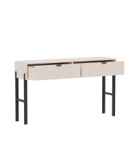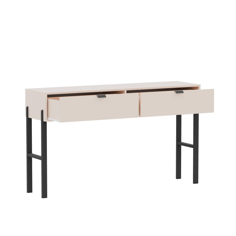 Elegancka i praktyczna toaletka Cremona w ciepłym beżu piaskowym to mebel, który łączy styl z funkcjonalnością. Jej wymiary (długość ok.140 cm, wysokość 83 cm, głębokość 37 cm) czynią ją idealną do mniejszych i średnich przestrzeni, zarówno w sypialni, jak i pokoju dziennym. Wyposażona w dwie pojemne szuflady na prowadnicach kulkowych z pełnym wysuwem, pozwala na wygodne przechowywanie kosmetyków, biżuterii i innych drobiazgów. Fronty wykonane z płyty MDF z ryflowaniem, obrzeża wykończone trwałym obrzeżem ABS, a konstrukcja oparta na solidnej płycie laminowanej gwarantują wytrzymałość i estetyczny wygląd przez lata. Dzięki kompaktowym rozmiarom i subtelnej kolorystyce, toaletka stanie się stylowym i praktycznym elementem wyposażenia Twojej przestrzeni.