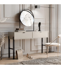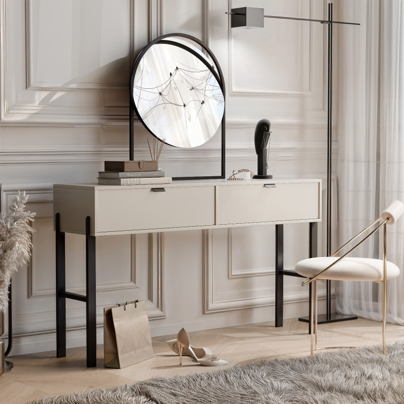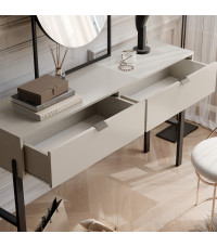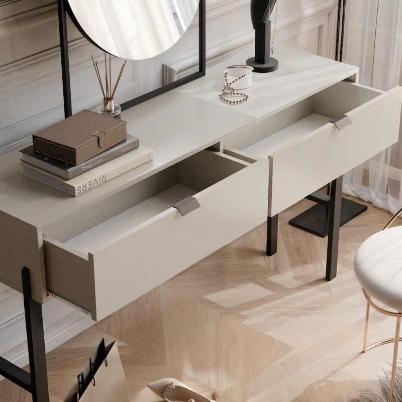 Toaletka Cremona 2S to połączenie nowoczesnego designu z funkcjonalnością. Jej minimalistyczna forma w kolorze beż piaskowy wprowadza do wnętrza spokój i elegancję. Dwie przestronne szuflady oferują wystarczająco dużo miejsca na kosmetyki, akcesoria czy drobne przedmioty codziennego użytku. Dzięki solidnej konstrukcji i dbałości o detale, toaletka stanie się praktycznym i estetycznym elementem Twojego wnętrza.