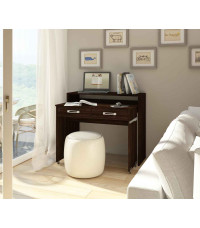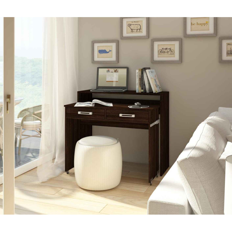 Nowoczesne i wyjątkowo praktyczne, dwuczęściowe biurko na kółkach, które można łatwo wysunąć, gdy potrzebujemy więcej miejsca, lub złożyć, gdy jest nieużywane. Dodatkowy blat pozwala na zwiększenie przestrzeni roboczej – idealny na drugi monitor lub inne akcesoria. Dzięki dwóm pojemnym szufladom mebel świetnie sprawdzi się zarówno jako biurko, jak i elegancka toaletka.