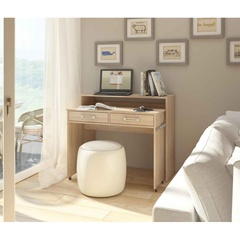 Nowoczesne i wyjątkowo praktyczne, dwuczęściowe biurko na kółkach, które można łatwo wysunąć, gdy potrzebujemy więcej miejsca, lub złożyć, gdy jest nieużywane. Dodatkowy blat pozwala na zwiększenie przestrzeni roboczej – idealny na drugi monitor lub inne akcesoria. Dzięki dwóm pojemnym szufladom mebel świetnie sprawdzi się zarówno jako biurko, jak i elegancka toaletka.