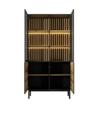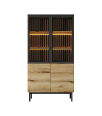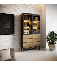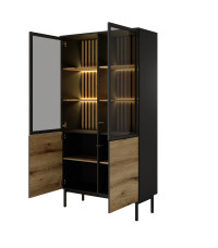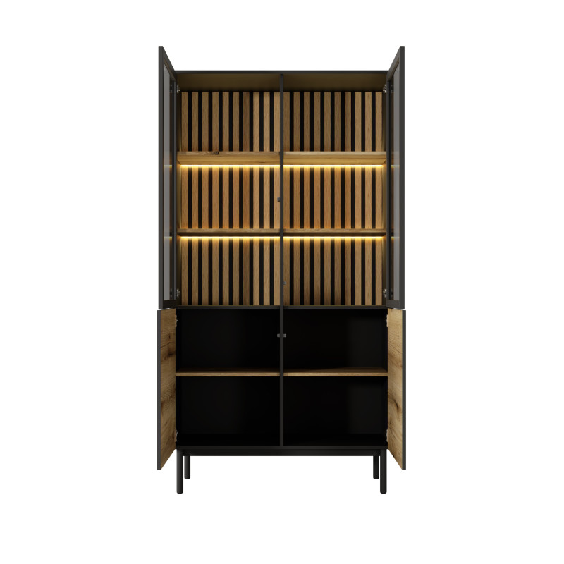 Witryna Lang A o szerokości 100,1 cm, wysokości 188,4 cm i głębokości 39,4 cm to elegancki mebel, który połączy nowoczesność z funkcjonalnością w Twoim wnętrzu. Korpus mebla w kolorze czarnym zestawiony z ramką w odcieniu dąb evoke wprowadza przytulny, ale jednocześnie elegancki charakter. Dzięki wbudowanemu oświetleniu LED o ciepłej barwie, witryna zyskuje dodatkowy walor estetyczny, który subtelnie podkreśli zawartość wnętrza, a także stworzy ciepłą, przyjazną atmosferę. Witryna oferuje przestronną komorę do przechowywania, a nowoczesny system push-to-open zapewnia łatwe otwieranie drzwi bez uchwytów. Solidne wykonanie z wysokiej jakości materiałów, takich jak płyta wiórowa laminowana oraz drewniane nogi w kolorze czarnym, gwarantują trwałość i stabilność mebla. Dzięki jej minimalistycznemu wyglądowi i funkcjonalności, witryna Lang A będzie doskonałym wyborem do każdego nowoczesnego salonu, jadalni czy przedpokoju.