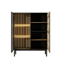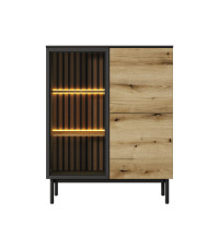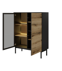 Witryna niska Lang to nowoczesny mebel, który idealnie komponuje się z przestrzenią dzienną. Charakteryzuje się eleganckim połączeniem czarnego korpusu z drewnianymi akcentami w kolorze dąb evoke. Oświetlenie LED w zestawie, o ciepłej barwie światła, delikatnie podkreśla jej walory estetyczne, tworząc przytulną atmosferę. Witryna oferuje przestronną komorę, idealną do przechowywania oraz wyeksponowania ulubionych przedmiotów, a system push-to-open zapewnia wygodne użytkowanie bez uchwytów.