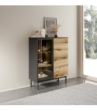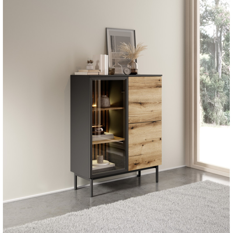 Witryna niska Lang o szerokości 100,1 cm, wysokości 125,4 cm i głębokości 39,4 cm to elegancka propozycja do każdego nowoczesnego wnętrza. Połączenie czarnego korpusu z detalami w kolorze dąb evoke wprowadza do przestrzeni ciepły i stylowy klimat. Oświetlenie LED, które znajduje się w zestawie, subtelnie rozświetli wnętrze witryny, tworząc przyjemną atmosferę. Dzięki przestronnej komorze, witryna zapewnia wystarczająco dużo miejsca do przechowywania, a funkcja push-to-open umożliwia łatwe otwieranie drzwi bez potrzeby uchwytów. Solidne, drewniane nogi w czarnym kolorze, połączone z trwałą płytą wiórową laminowaną, gwarantują stabilność i wytrzymałość mebla. Witryna Lang B to doskonała opcja do salonu, jadalni czy przedpokoju, wprowadzając nowoczesny akcent do każdego pomieszczenia.