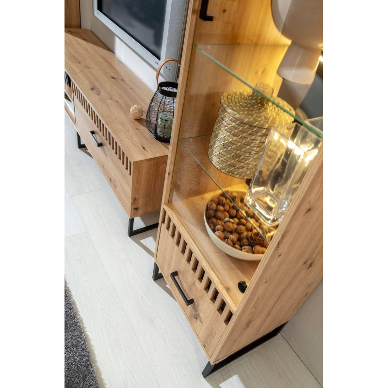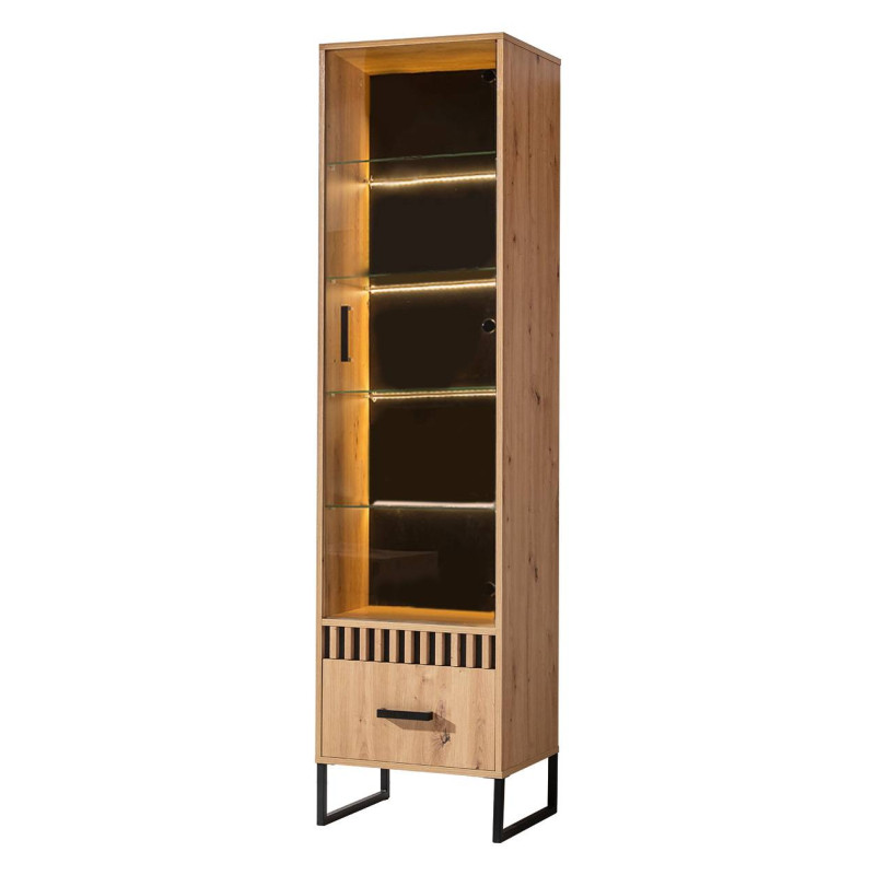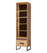 Witryna LAMELIX to praktyczny i pojemny mebel, który będzie pięknie prezentować się w salonie, pokoju dziennym czy jadalni. Witryna z lamelami prezentuje się ponadczasowo i elegancko. Składa się jednej szuflady oraz jednych przeszklonych drzwiczek. Model ten wykonany jest z wysokiej jakości płyty laminowanej, dzięki czemu wyróżnia się trwałością i odpornością na działanie wilgoci, wysokiej temperatury, a także różnego rodzaju zarysowania i zabrudzenia.