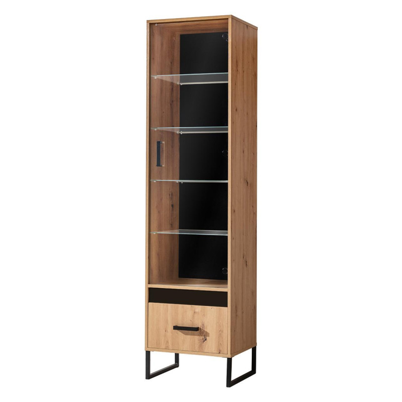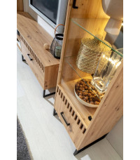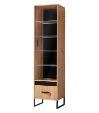 Witryna LAMELIX 03 to stylowy i funkcjonalny mebel z kolekcji LAMELIX, idealny do nowoczesnych wnętrz. Model marki Domel wyróżnia się eleganckim designem, który nada pomieszczeniu luksusowy i harmonijny charakter. Dzięki zastosowaniu wysokiej jakości laminowanej płyty meblowej, witryna jest trwała oraz odporna na wilgoć, zarysowania i zabrudzenia, co zapewnia jej długowieczność i łatwość w utrzymaniu. Jej wymiary – 50 cm szerokości, 196 cm wysokości i 40 cm głębokości – sprawiają, że jest kompaktowa, a jednocześnie pojemna. Górna, przeszklona część doskonale nadaje się do eksponowania książek, pamiątek czy dekoracji, dodając wnętrzu elegancji. Dolna część jest zamknięta i zawiera przestronną szufladę, idealną do przechowywania przedmiotów codziennego użytku, co pomaga zachować porządek. Nowoczesny charakter witryny podkreślają metalowe uchwyty i nogi, które nadają jej loftowy styl. Naturalny odcień dąb artisan wnosi do wnętrza ciepło i przytulność, a matowe fronty podkreślają minimalistyczną estetykę, doskonale komponującą się z różnymi aranżacjami. Witryna LAMELIX 03 to idealne połączenie estetyki i funkcjonalności. Oferuje praktyczną przestrzeń do przechowywania, a jednocześnie stanowi elegancką ozdobę wnętrza. Doskonale sprawdzi się w salonie, jadalni czy innych pomieszczeniach, gdzie liczy się zarówno nowoczesny design, jak i wygoda użytkowania.